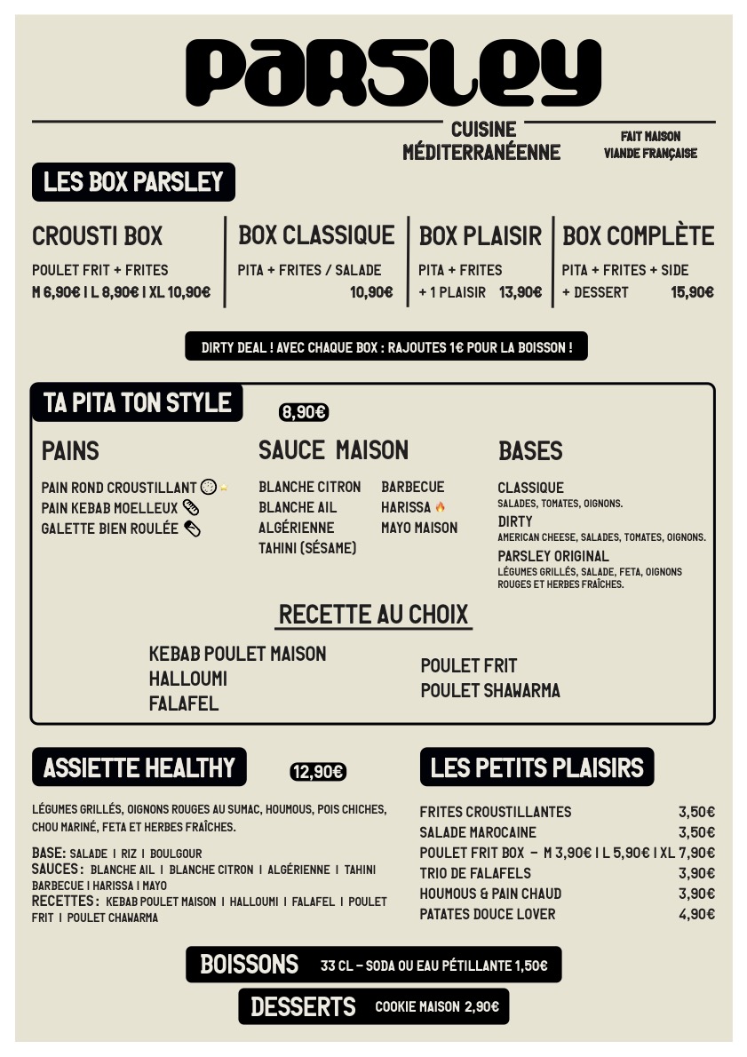👉 Que ce soit sur place, à emporter ou en livraison (Uber Eats & Deliveroo), Parsley vous propose un kebab unique, préparé avec passion chaque jour.